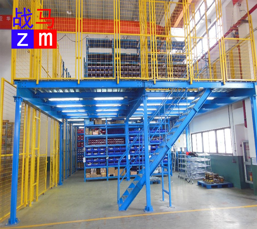鋼結構平臺:一樓圓管/方管做立柱支撐,二層為平臺;適用于庫房較高,堆放較密集的情況。(一般為托盤平地碼放)一樓叉車/堆高車存取,二樓人工/搬運車存取的情況。可配合升降平臺使用。